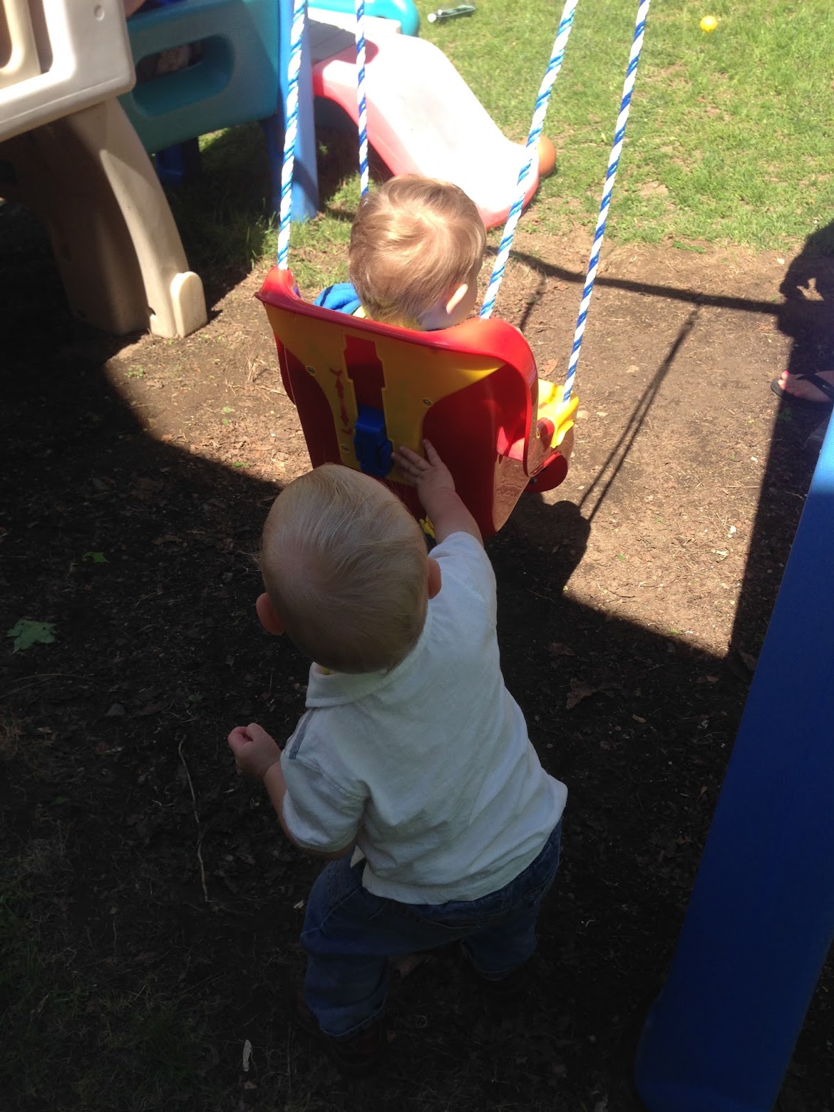 Giving his friend (who is one day younger than he is) a push on the swing