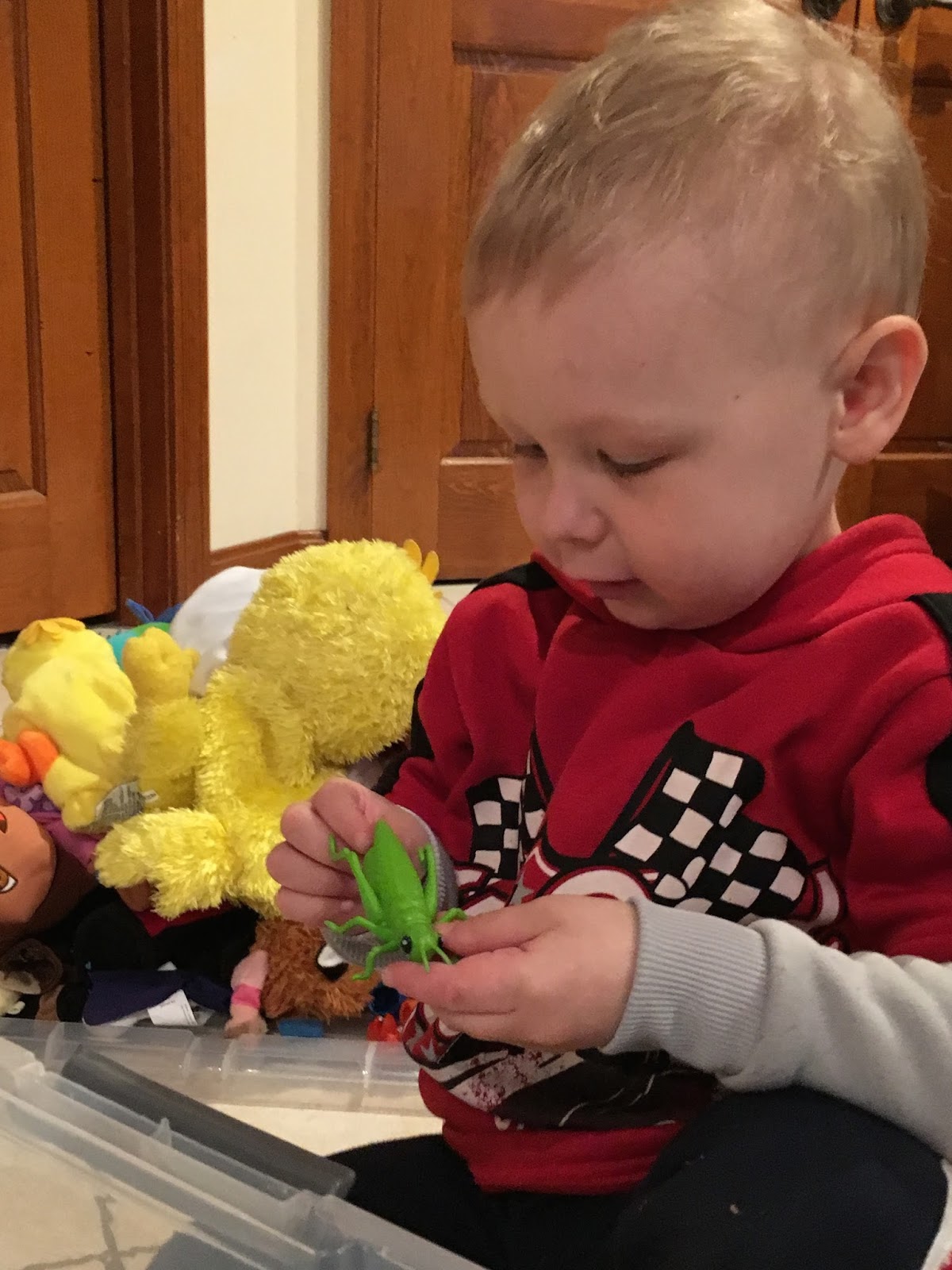 With a grasshopper finger puppet at home